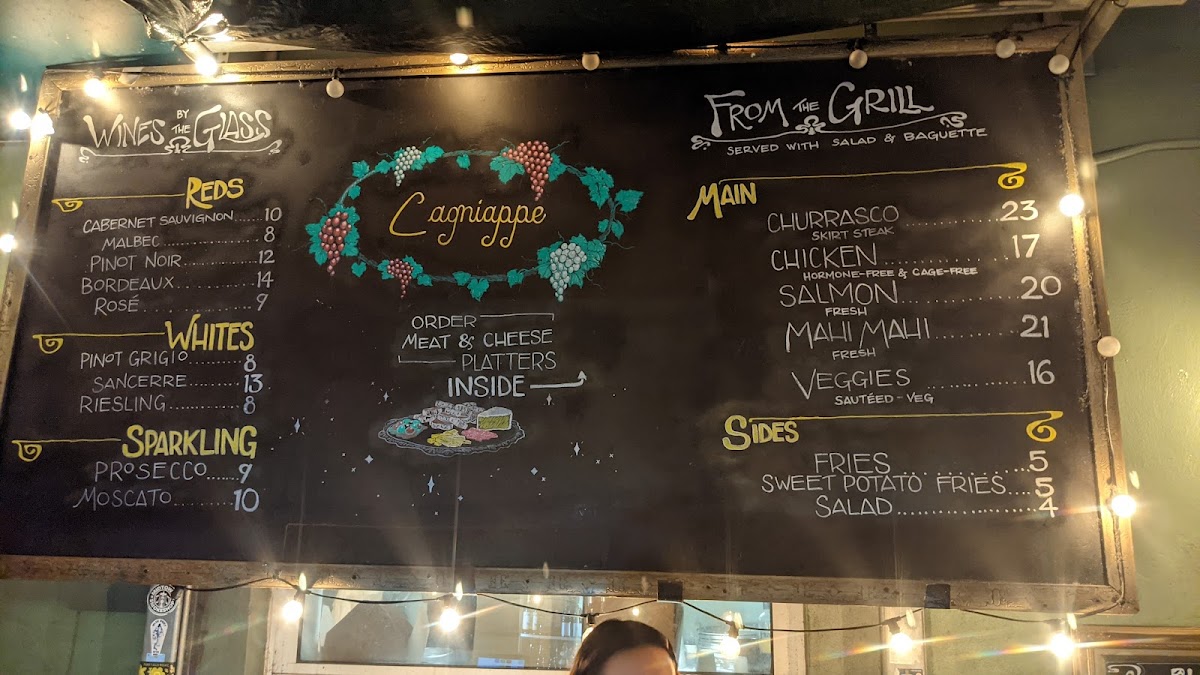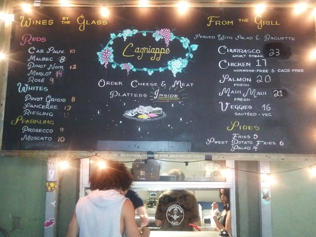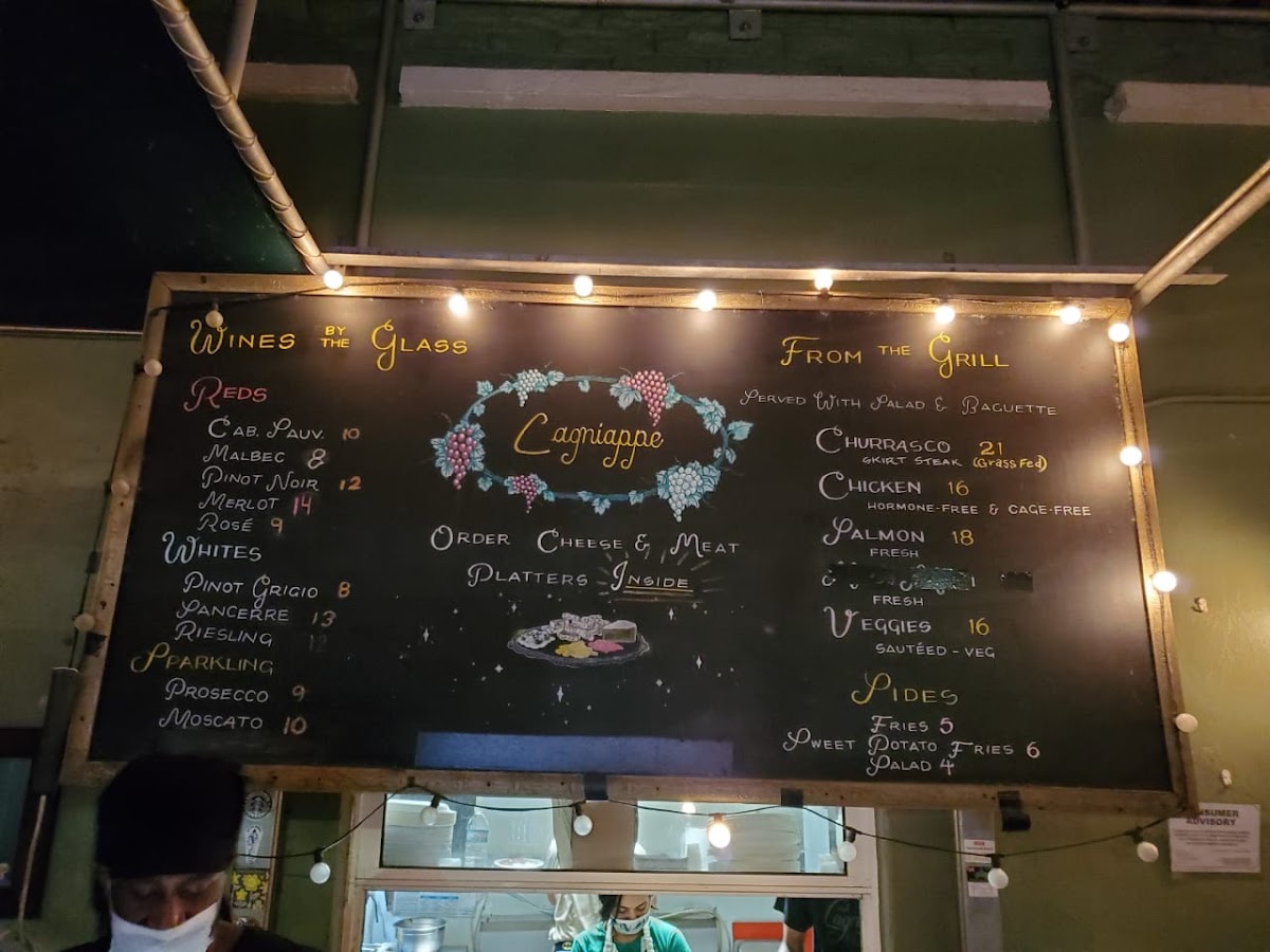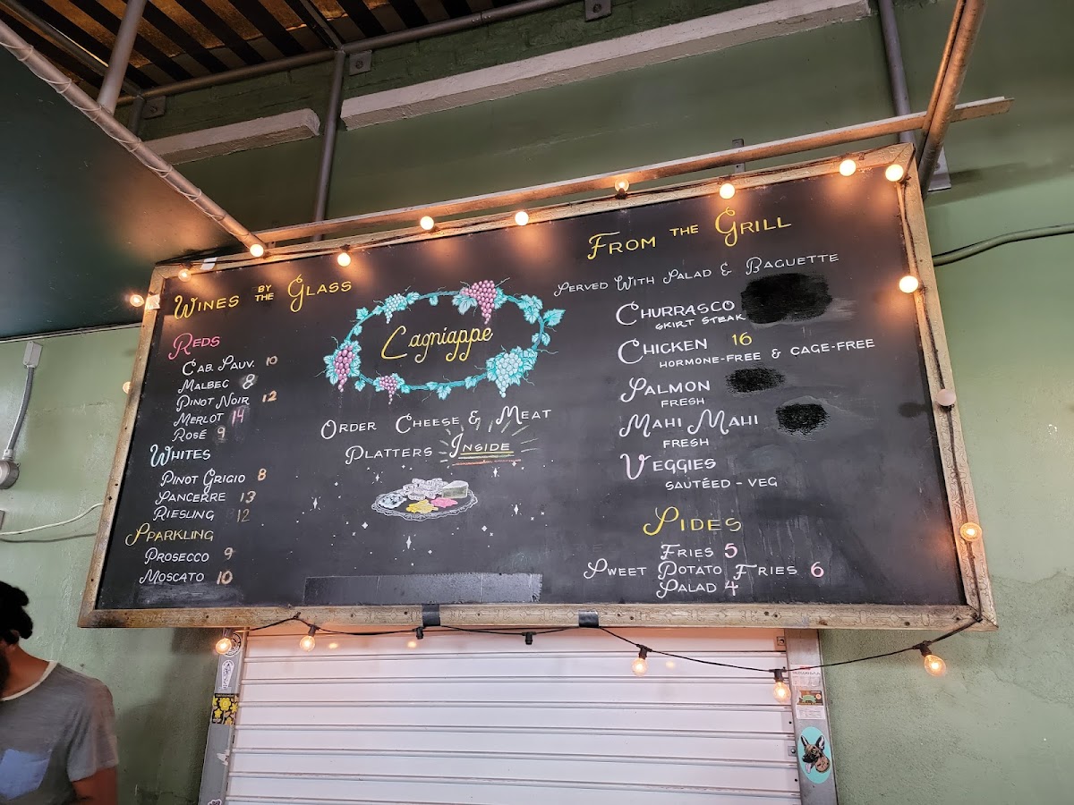Food is centered around shareable plates such as charcuterie boards with assorted meats and cheeses, and cheese boards that can be customized. Light meal options from the grill include items like Churrasco, fresh wild-caught fish (Mahi and Salmon), BBQ chicken, and sautéed vegetables, providing a variety of protein and vegetable choices.