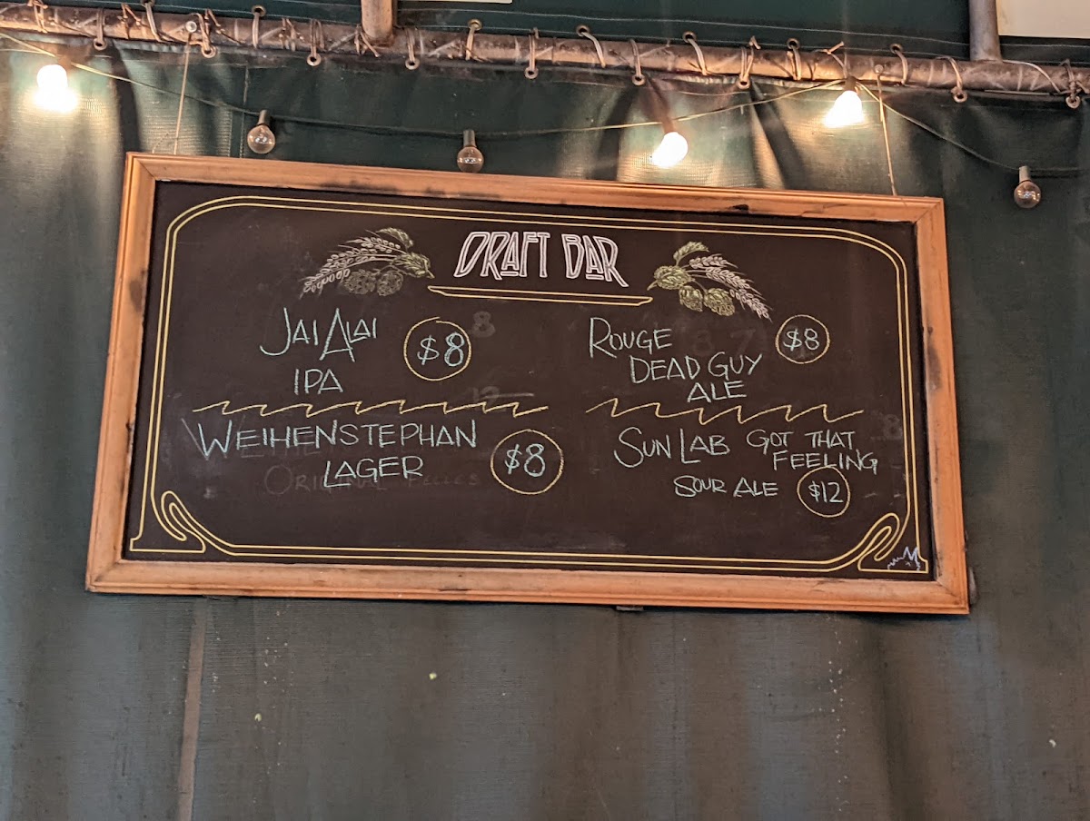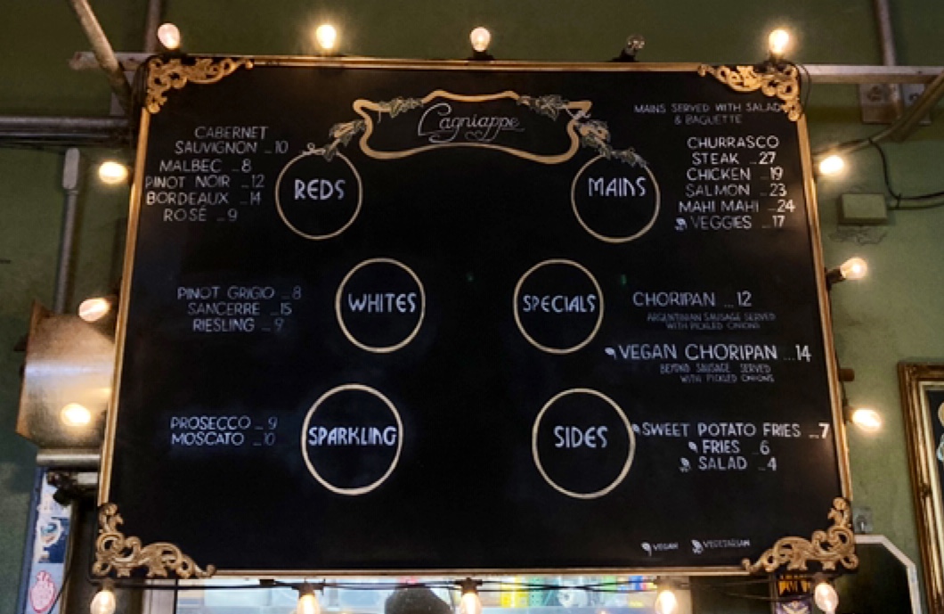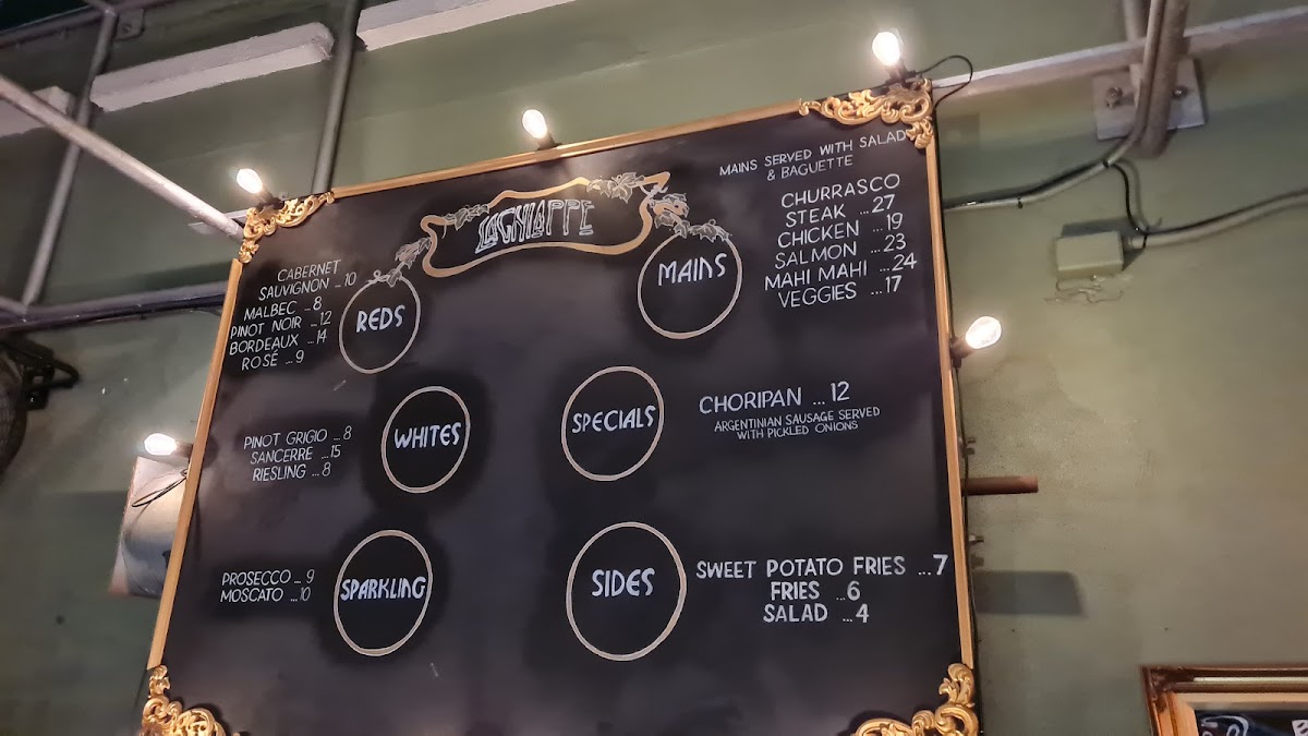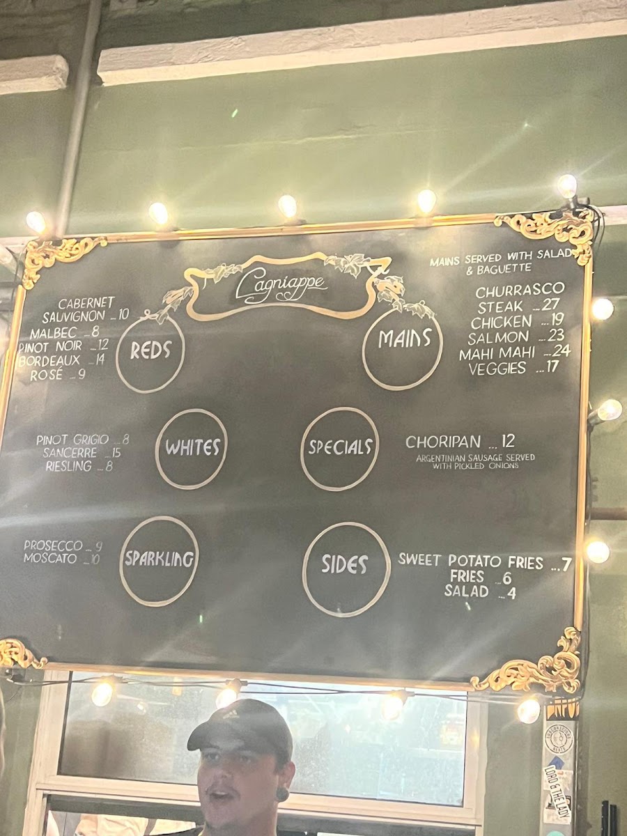 Food is centered around shareable plates such as charcuterie boards with assorted meats and cheeses, and cheese boards that can be customized. Light meal options from the grill include items like Churrasco, fresh wild-caught fish (Mahi and Salmon), BBQ chicken, and sautéed vegetables, providing a variety of protein and vegetable choices.